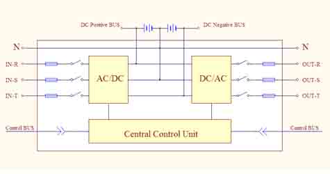 功率模块采用多制式在线式双变换技术,将市电整流、滤波、稳压后变换为直流电,该直流电在为后级逆变电路供电的同时又对电池组进行充电和管理,后级逆变电路为一高效率的三阶正弦波调制电路,再将直流电重新逆变为交流电,为负载提供稳压、稳频、持续、可靠的电源。其交流输入为三相或单相市电,输出直流为±384V为专用电池组充电,输出交流为三相或单相正弦波交流电压。